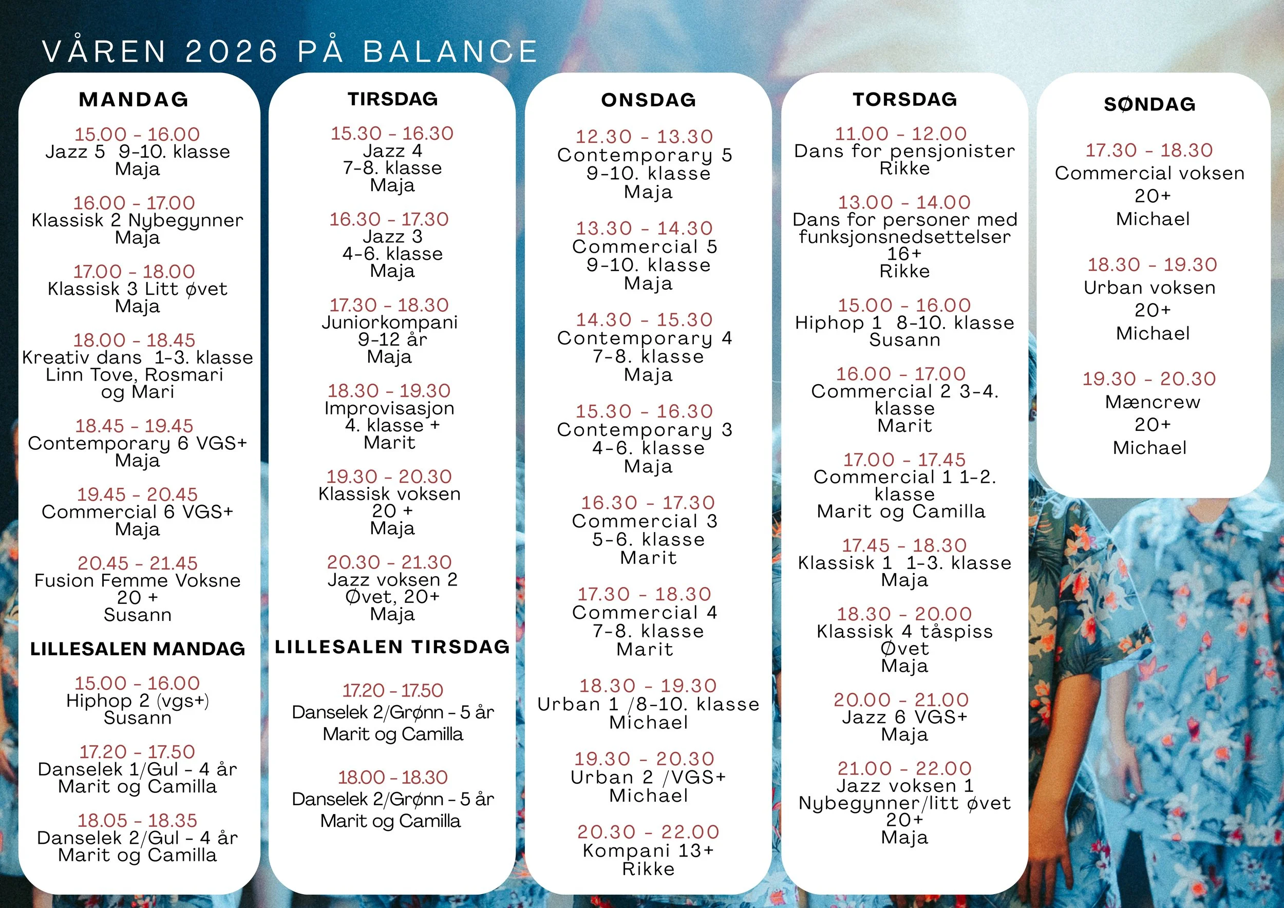 *Klassisk ballett deles inn etter nivå, ikke alder, med unntak av barnedans. Ta kontakt med oss for veiledning rundt påmelding i passende gruppe.